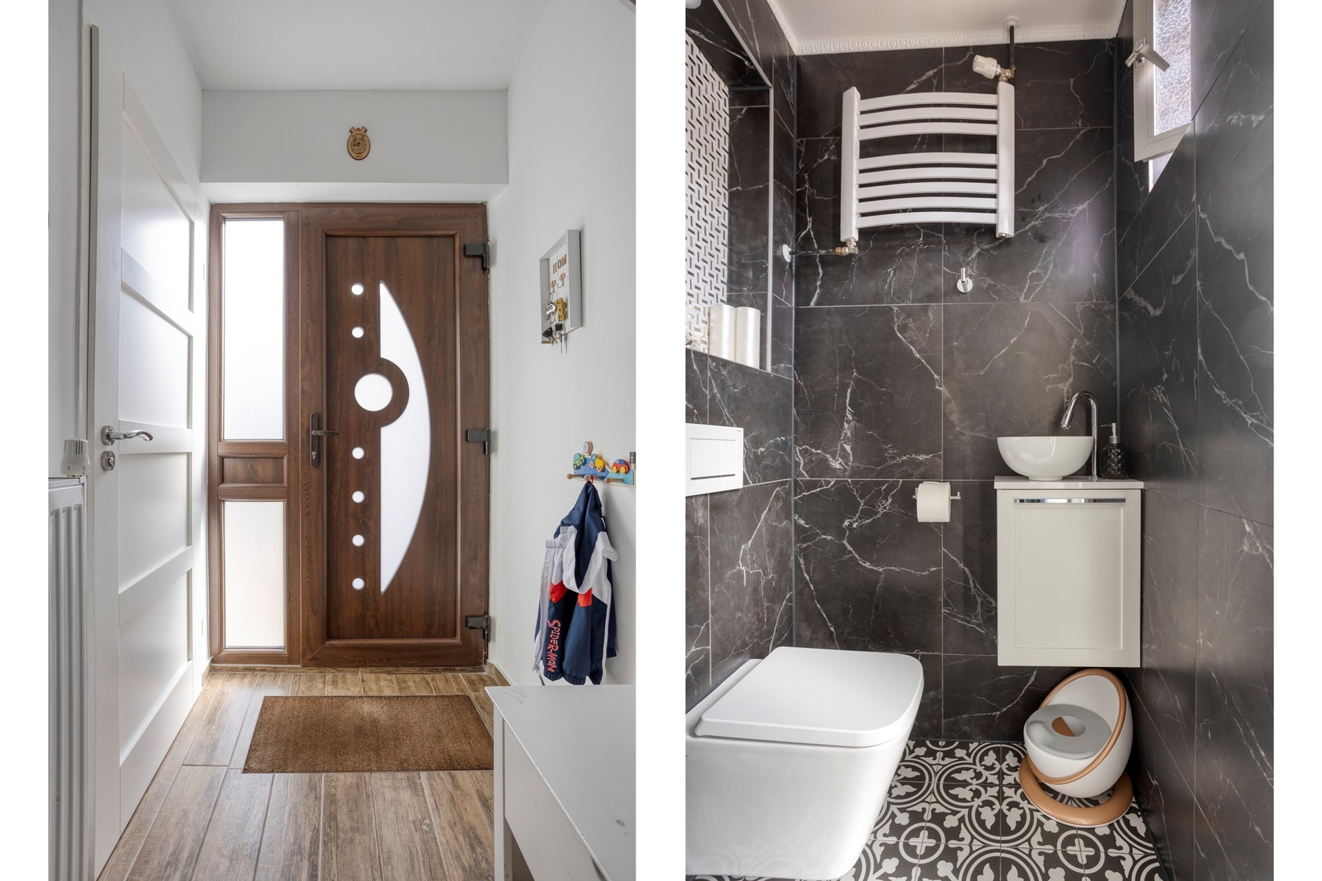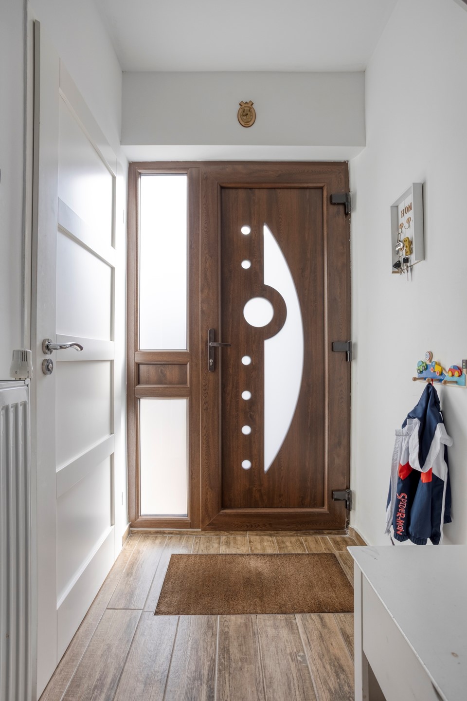 Bij binnenkomst word je verwelkomd in een ruime en lichte hal, afgewerkt met een nette laminaatvloer en stucwerk wanden. Vanuit de hal heb je toegang tot de meterkast (vernieuwd), een moderne toiletruimte met toilet en fonteintje, de trapopgang naar de eerste verdieping en de woonkamer met open keuken.