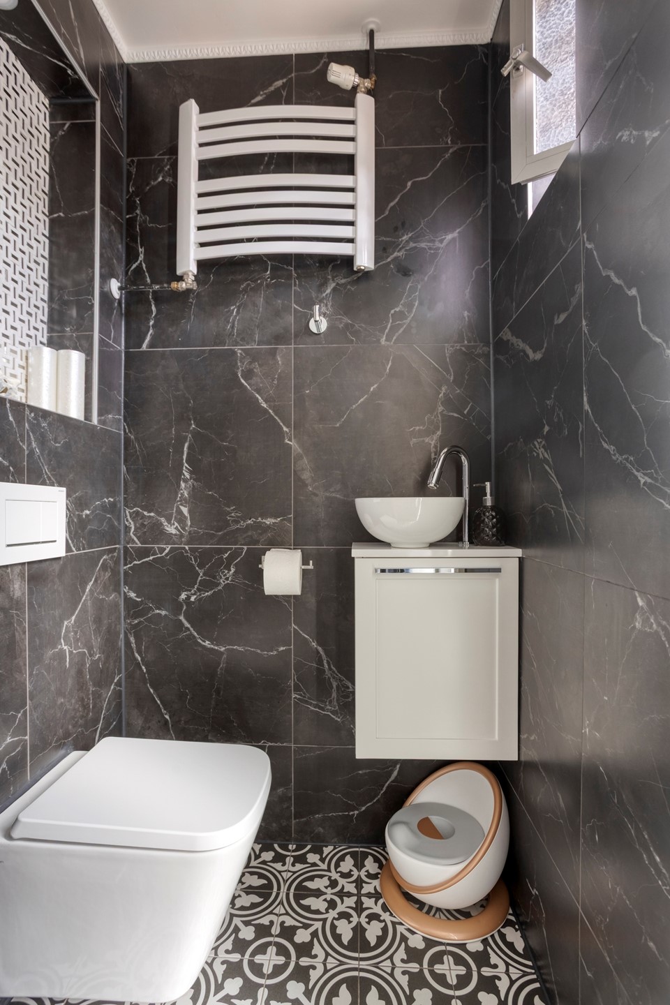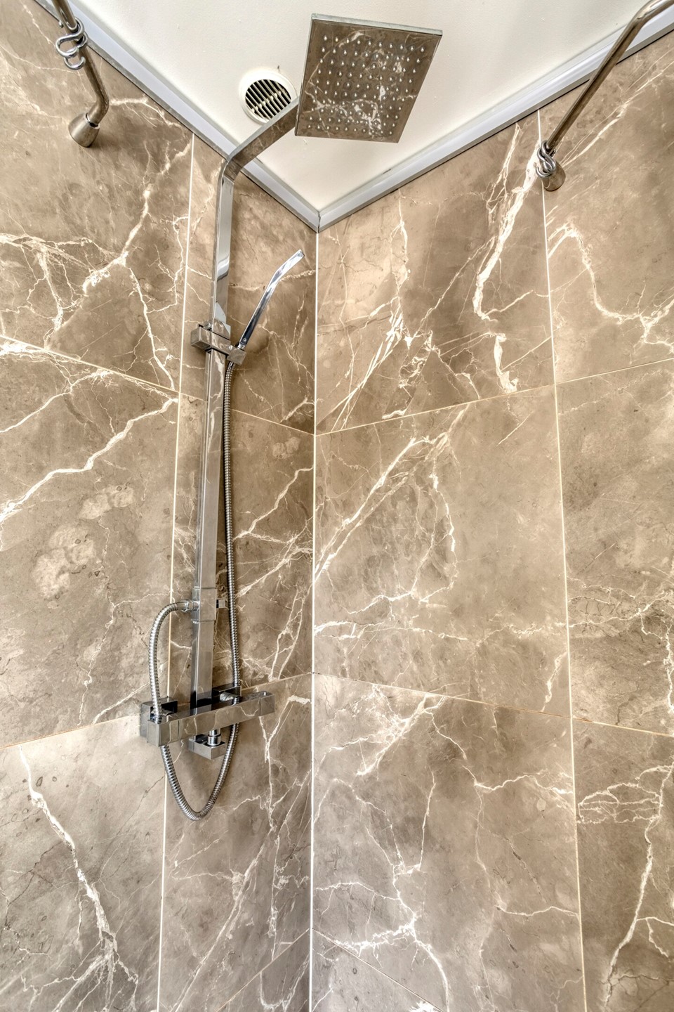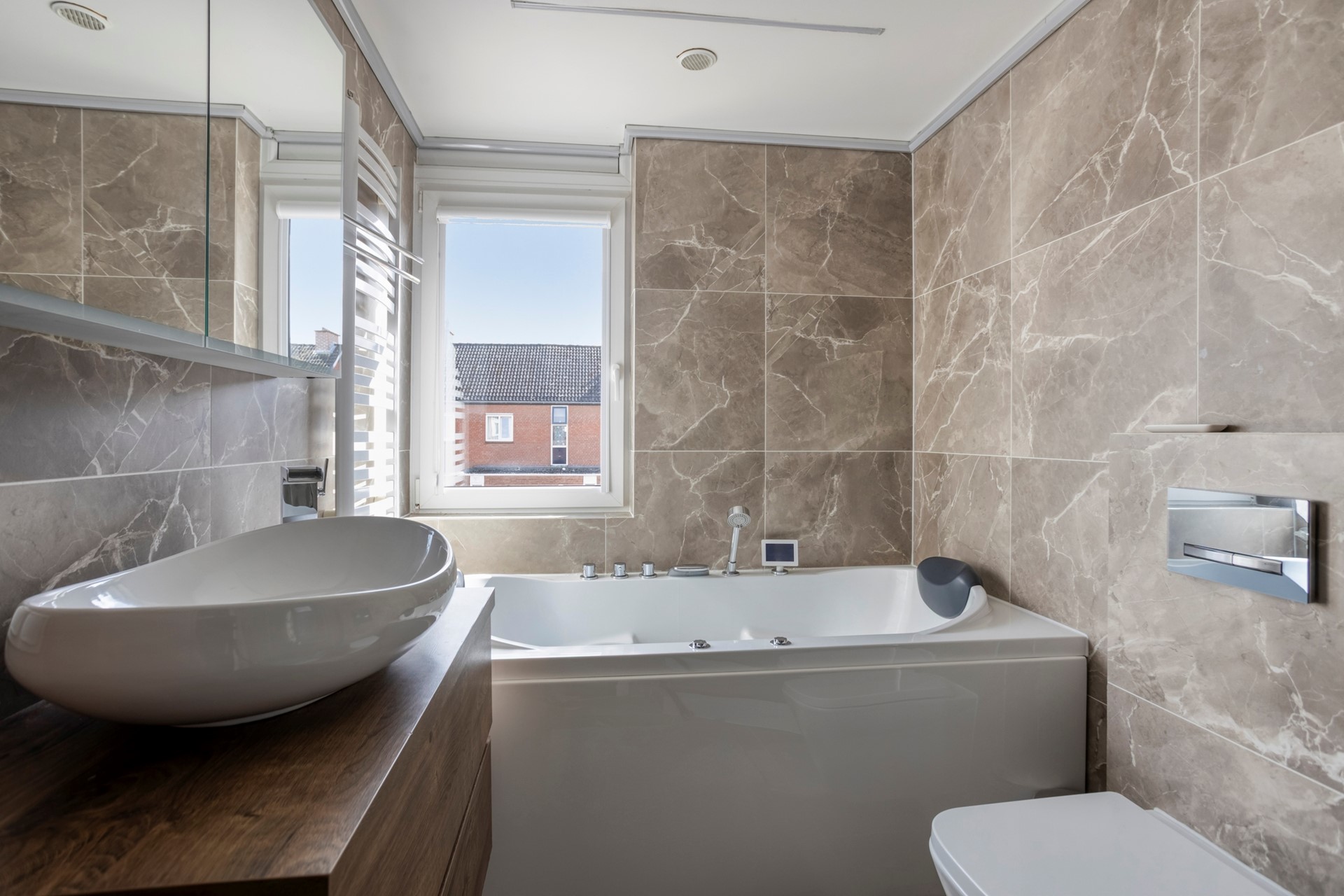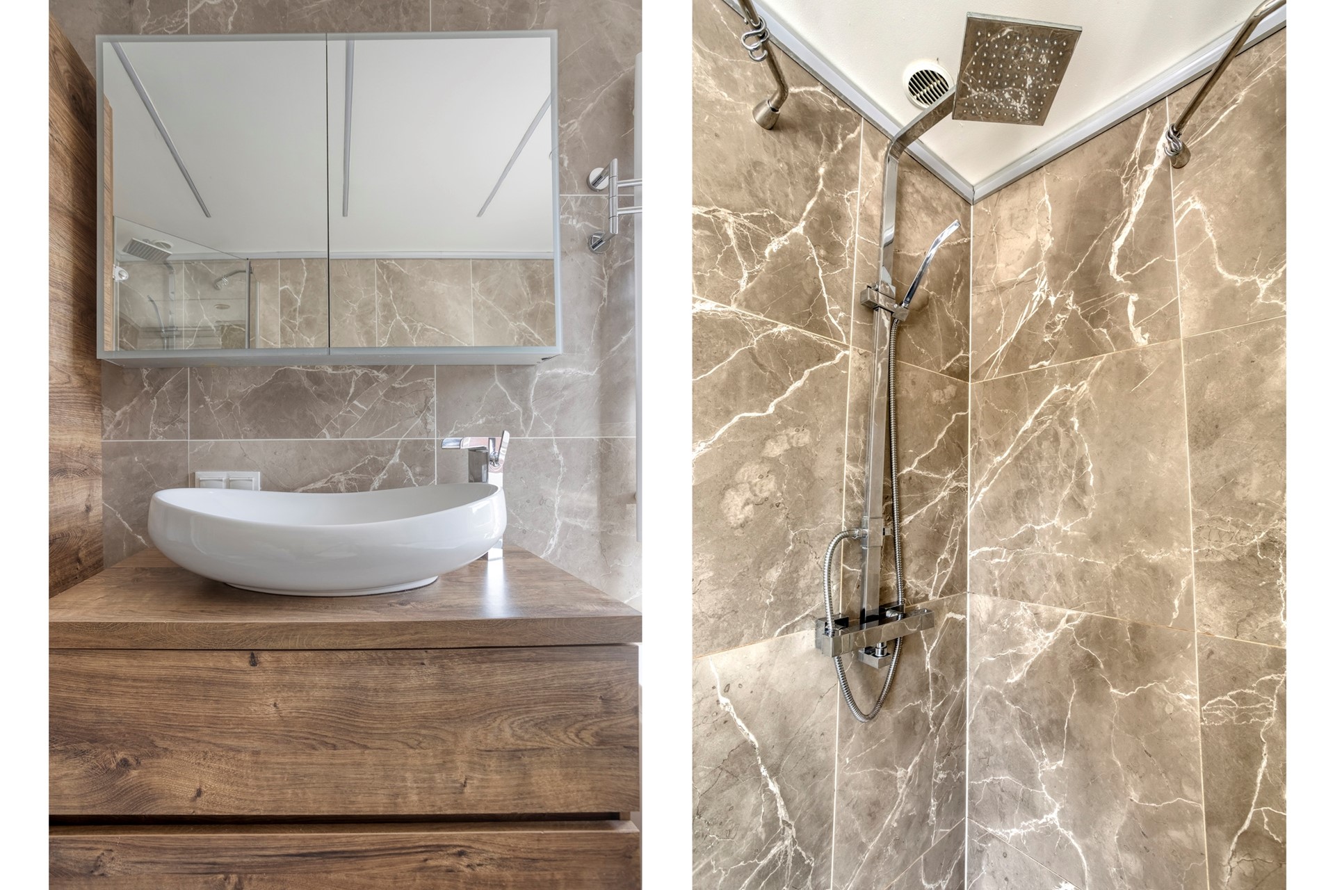 De smaakvolle badkamer is schitterend afgewerkt. De badkamer is volledig betegeld en beschikt over een luxe bubbelbad, inloopdouche, toilet en badkamermeubel.