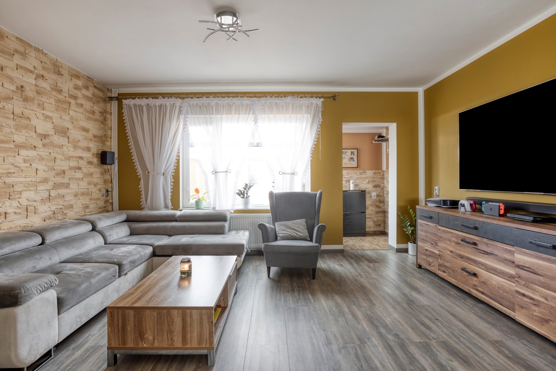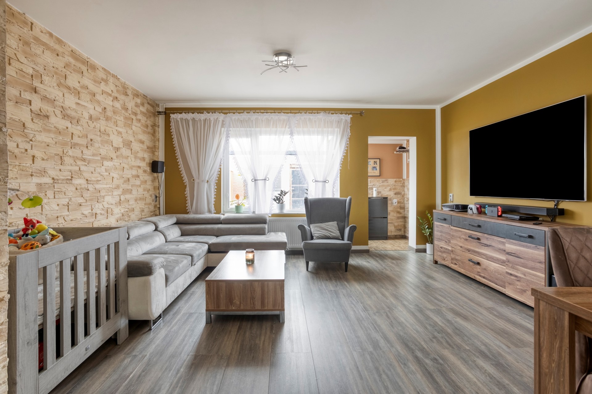 De lichte woonkamer beschikt over een praktische trapkast, het laminaat is vanuit de hal doorgetrokken woonkamer en keuken De wanden in de woonkamer zijn afgewerkt met steenstrips.