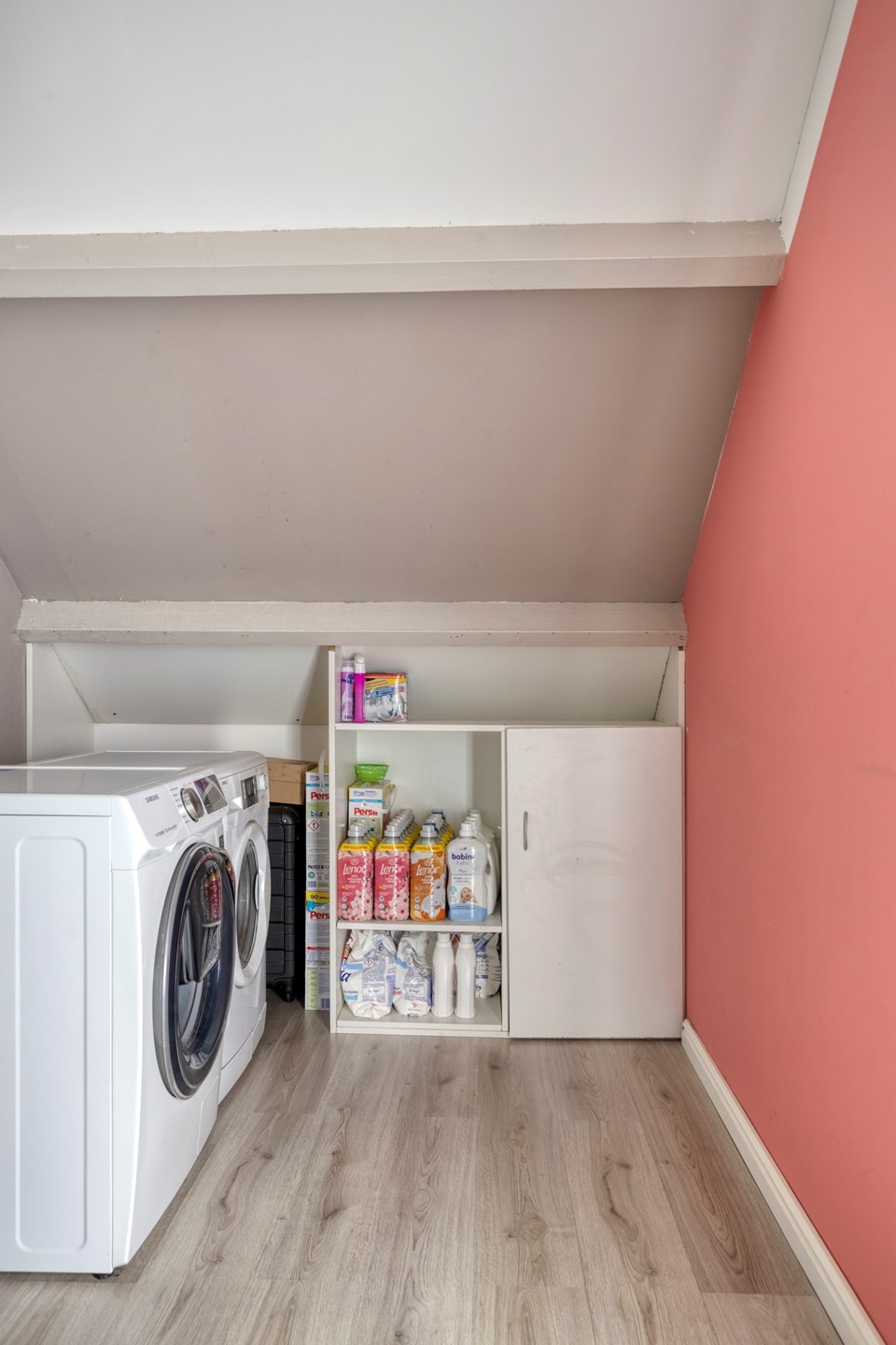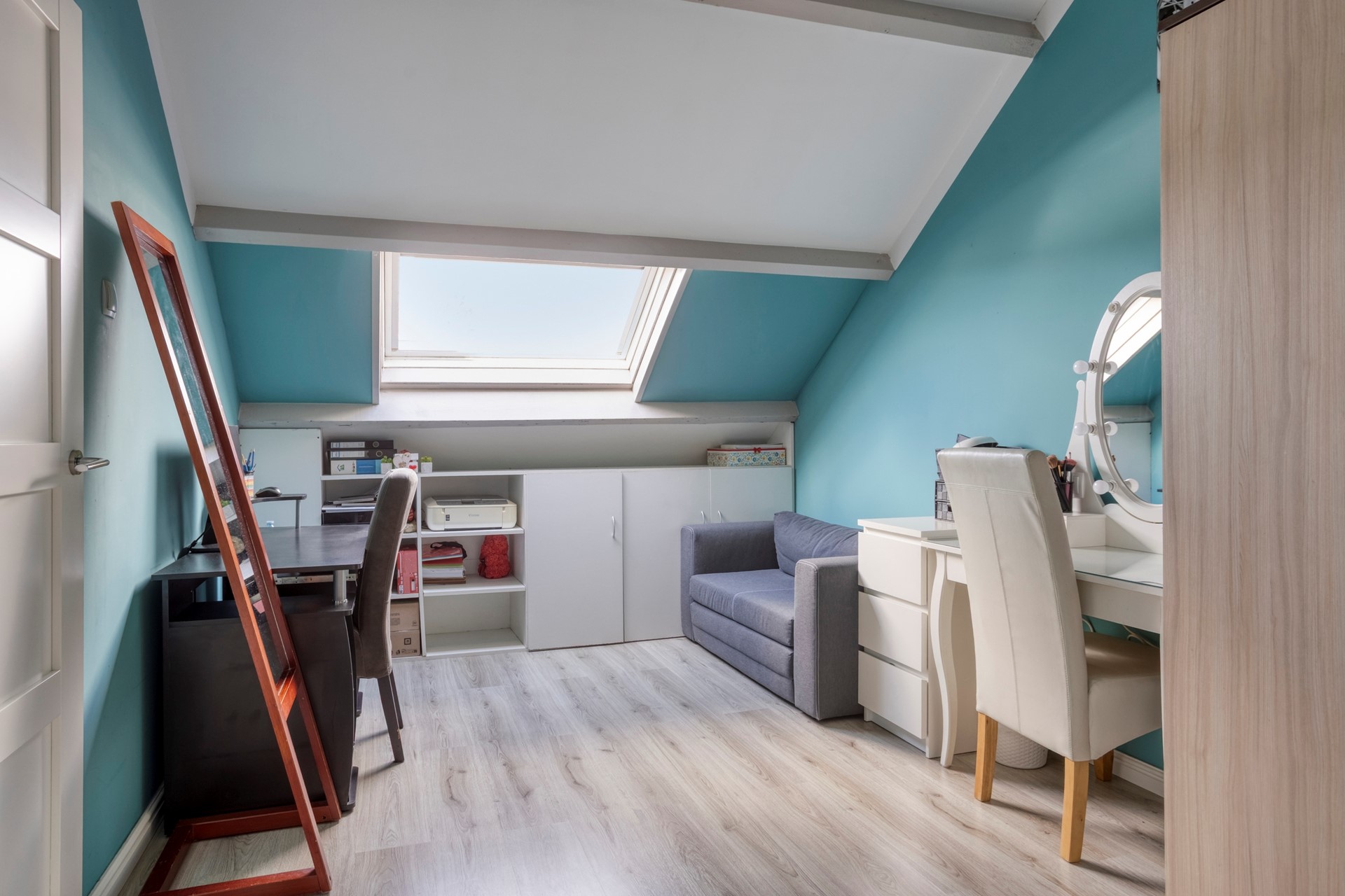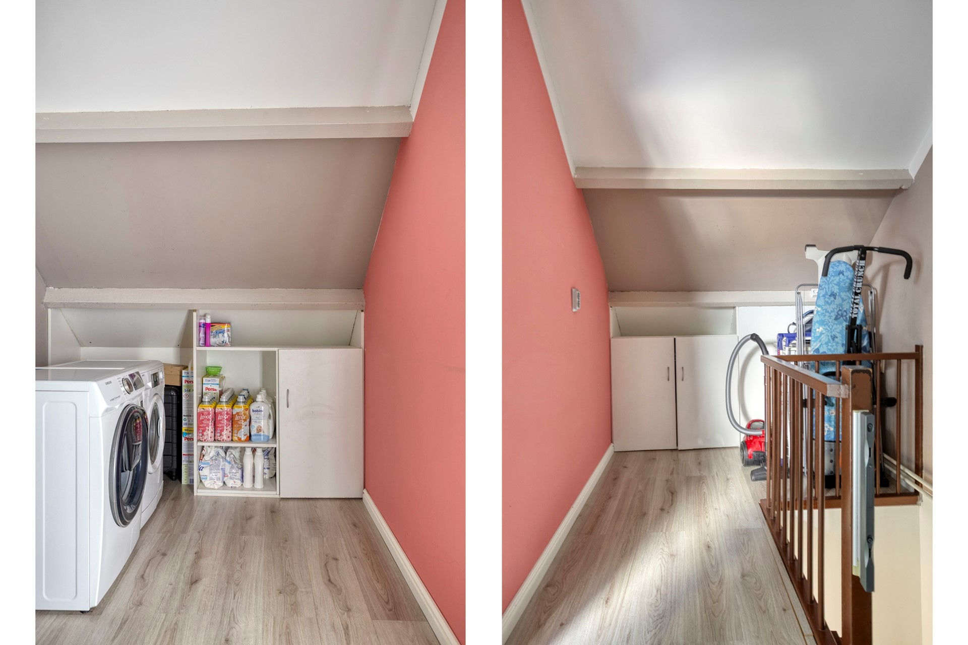Via een vaste trap bereik je de zolderverdieping, waar de vierde slaapkamer zich bevindt. Dankzij het grote raam is deze slaapkamer opvallend licht en ruim. De vloer is afgewerkt met laminaat. Op de voorzolder zijn de aansluitingen voor de wasmachine en droger te vinden. Deze ruimte leent zich uitstekend voor het creëren van een aparte wasruimte of extra opslag. Ook de cv-installatie bevindt zich hier.