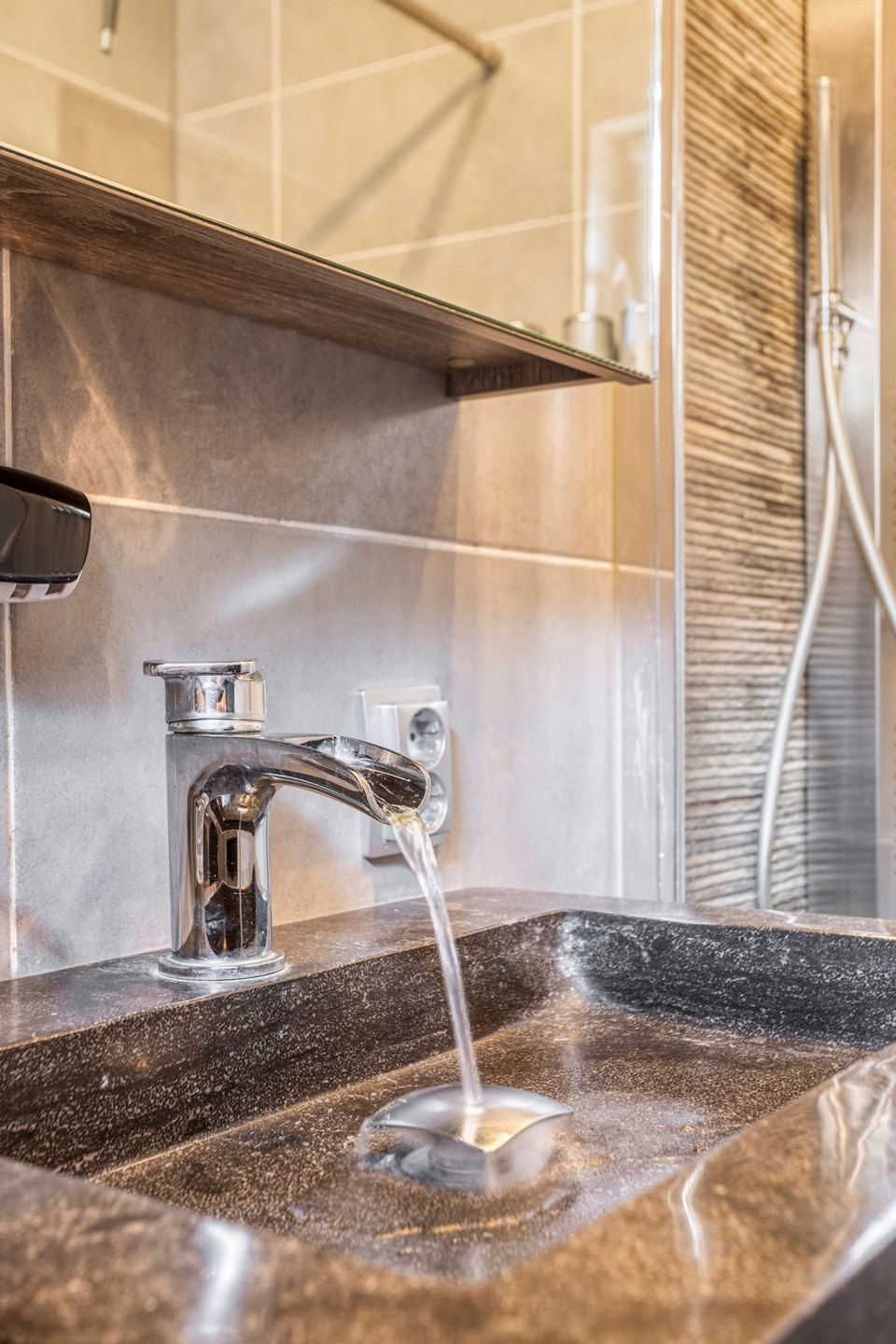 De moderne toiletruimte is voorzien van hardstenen wasbakje met onderkast en zwart hangcloset.