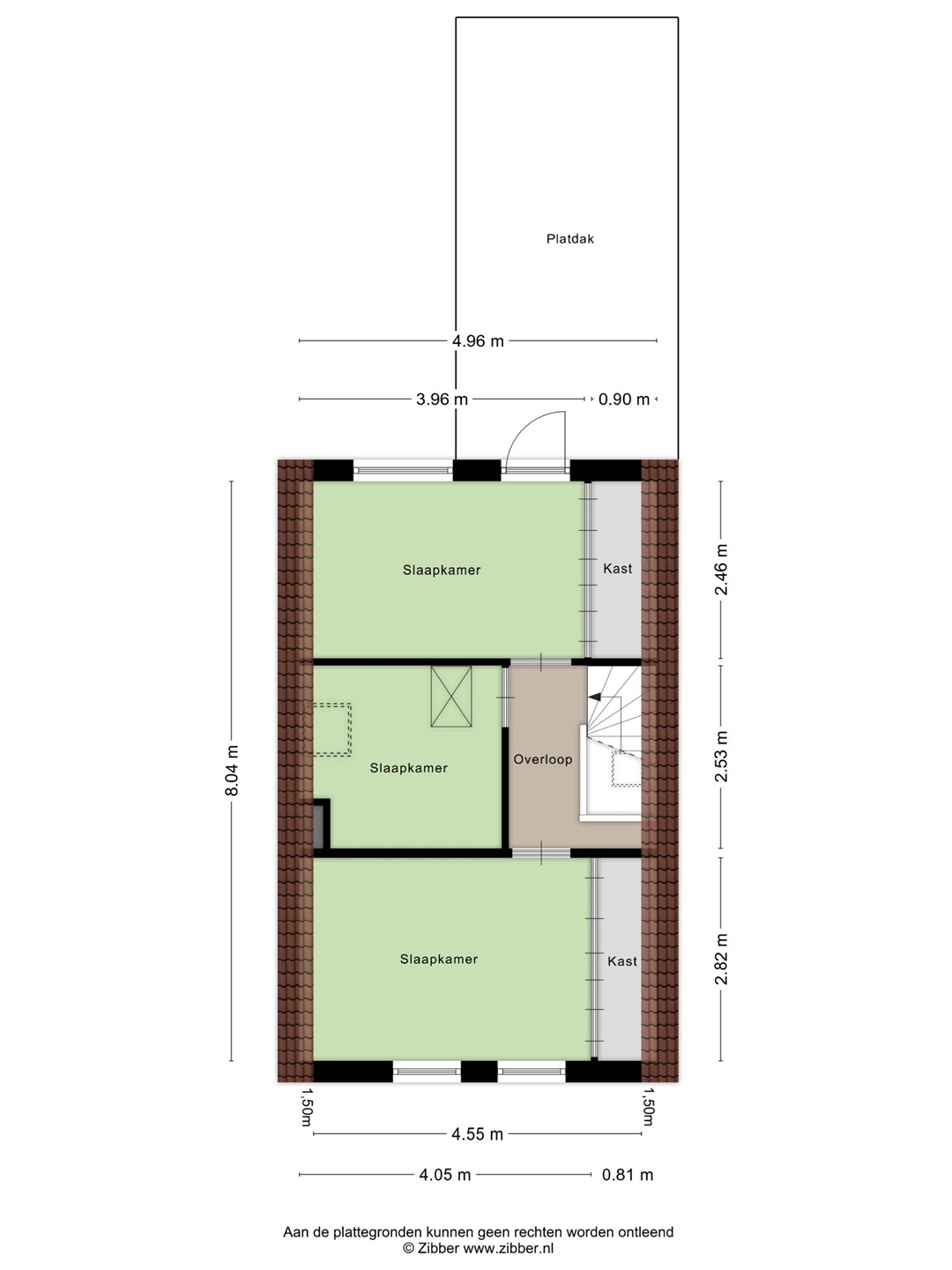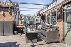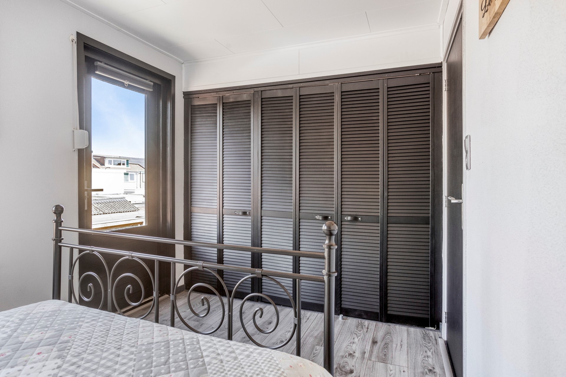 Slaapkamer II (ca. 10 m²), aan de achterzijde van de woning is voorzien van rolluiken, deur naar plat dak en inbouwkast. Deze slaapkamer is eveneens licht en prettig van formaat,