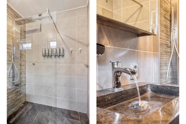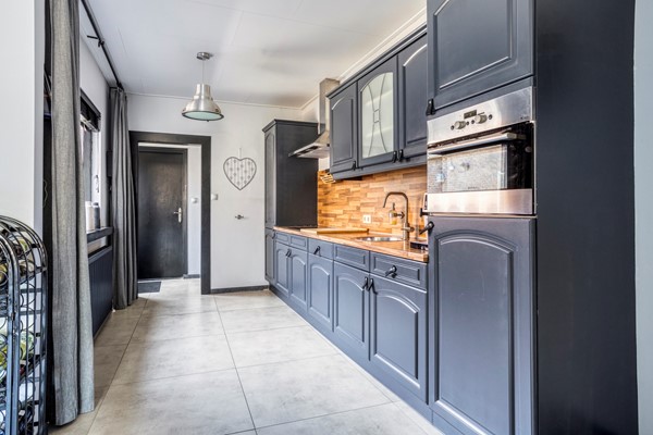 Aansluitend bevindt zich de open keuken, voorzien van diverse inbouwapparatuur zoals een inductiekookplaat, afzuigschouw, vaatwasser, koelkast en combi-magnetron. Een fijne plek om uitgebreid te koken én in contact te blijven met de woonkamer.