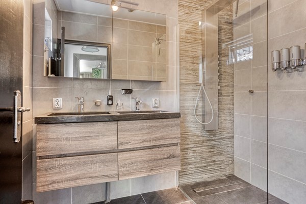Vanuit het portaal bereikt u niet alleen de tuin, maar ook het toilet en de moderne badkamer. De Badkamer is uitgerust met een stijlvol dubbel badkamermeubel en inloopdouche.