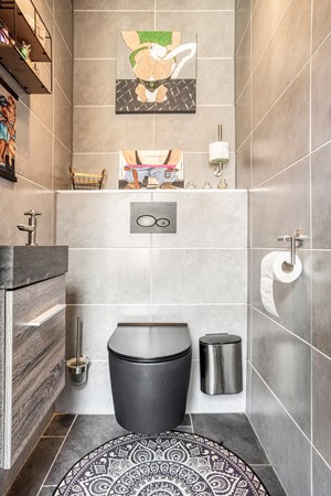 De moderne toiletruimte is voorzien van hardstenen wasbakje met onderkast en zwart hangcloset.