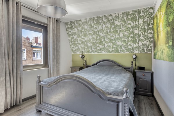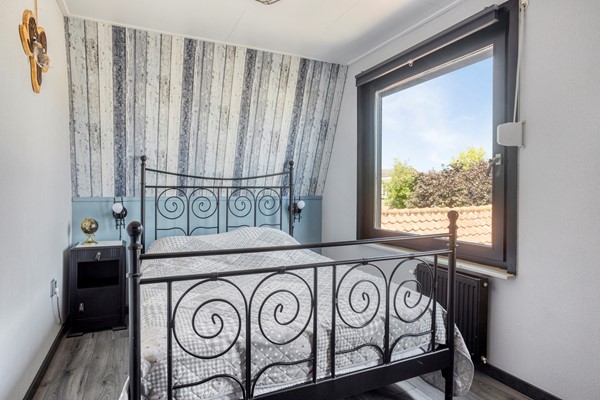 Slaapkamer II (ca. 10 m²), aan de achterzijde van de woning is voorzien van rolluiken, deur naar plat dak en inbouwkast. Deze slaapkamer is eveneens licht en prettig van formaat,