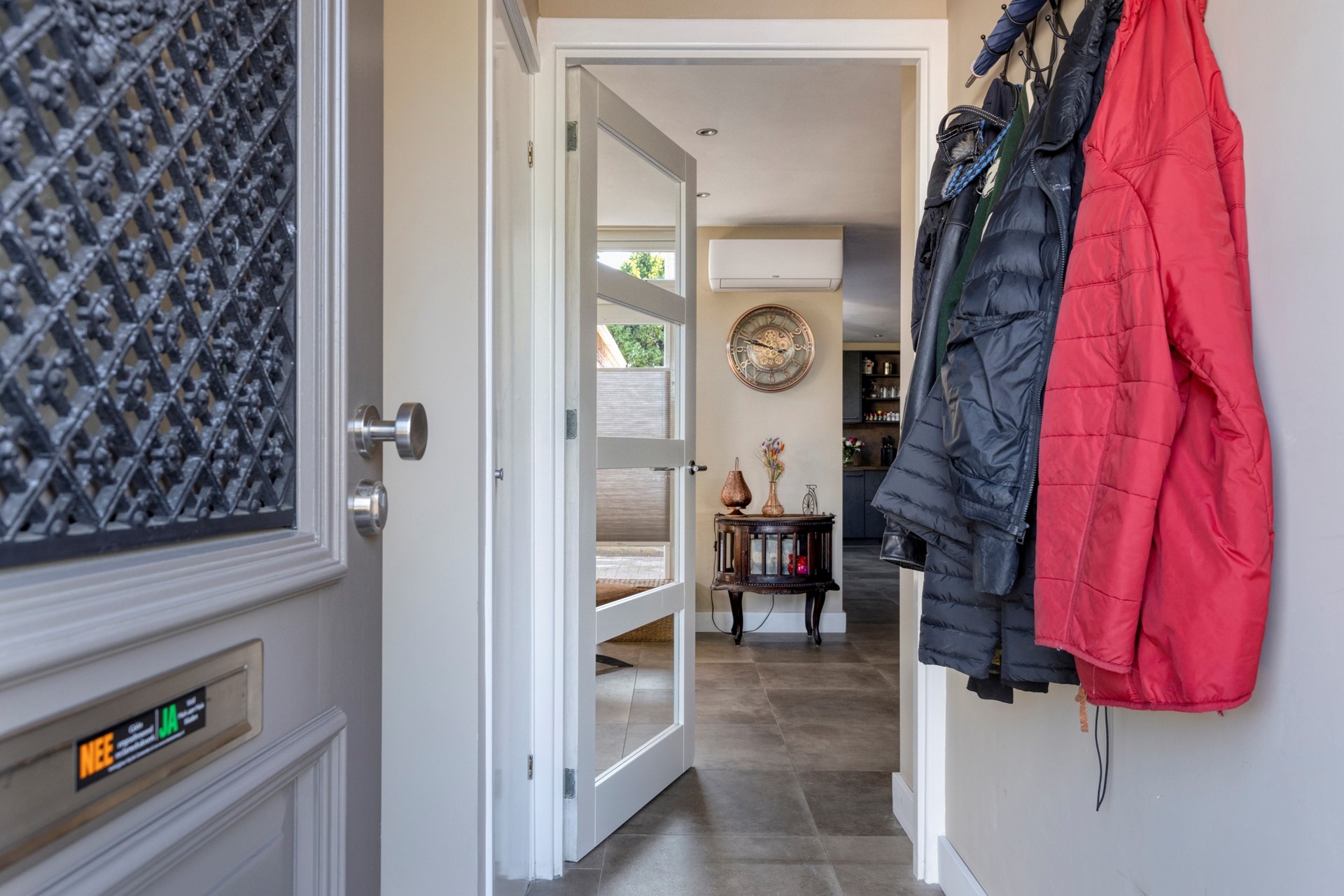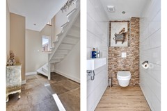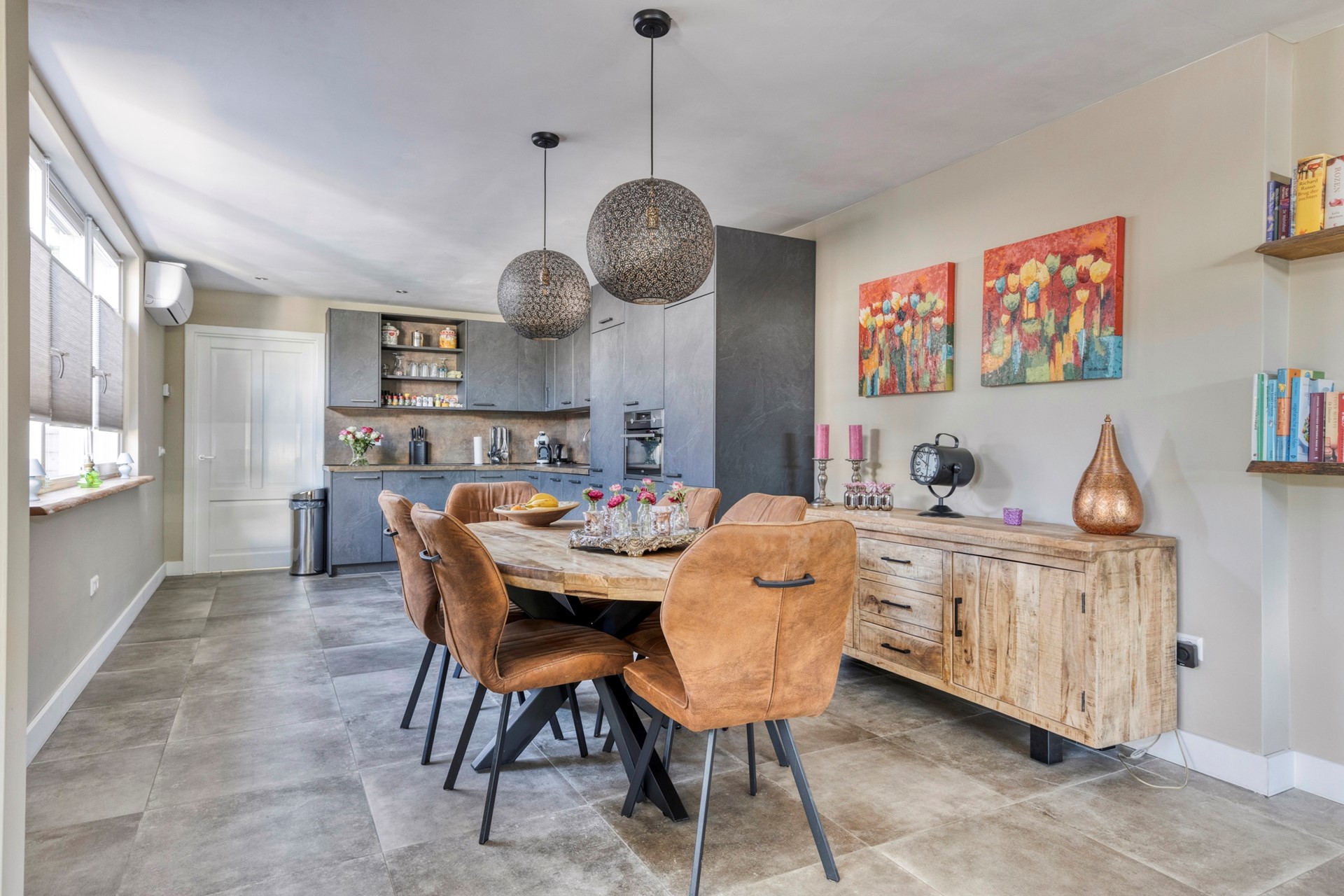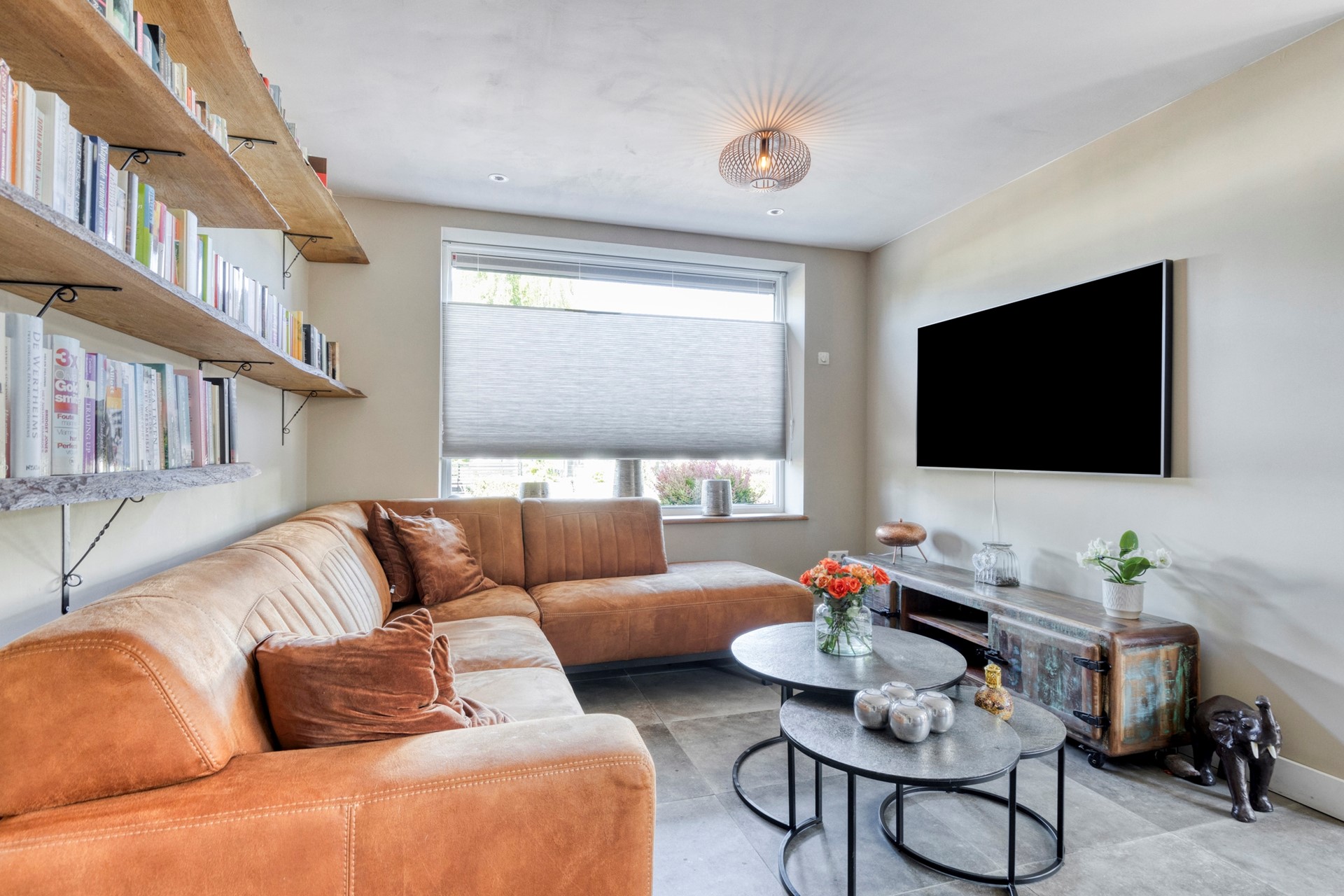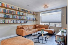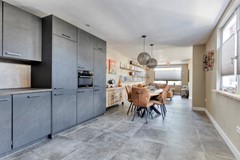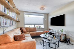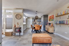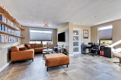 De lichte en sfeervolle woonkamer (samen met de keuken ca. 51 m²) is voorzien van vloerverwarming en airco. Dankzij de vele raampartijen is er volop natuurlijk daglicht. Door de speelse indeling met diverse hoeken is deze ruimte praktisch en flexibel in te richten. Via openslaande deuren stapt u zo de achtertuin in – ideaal voor binnen-buitenleven!