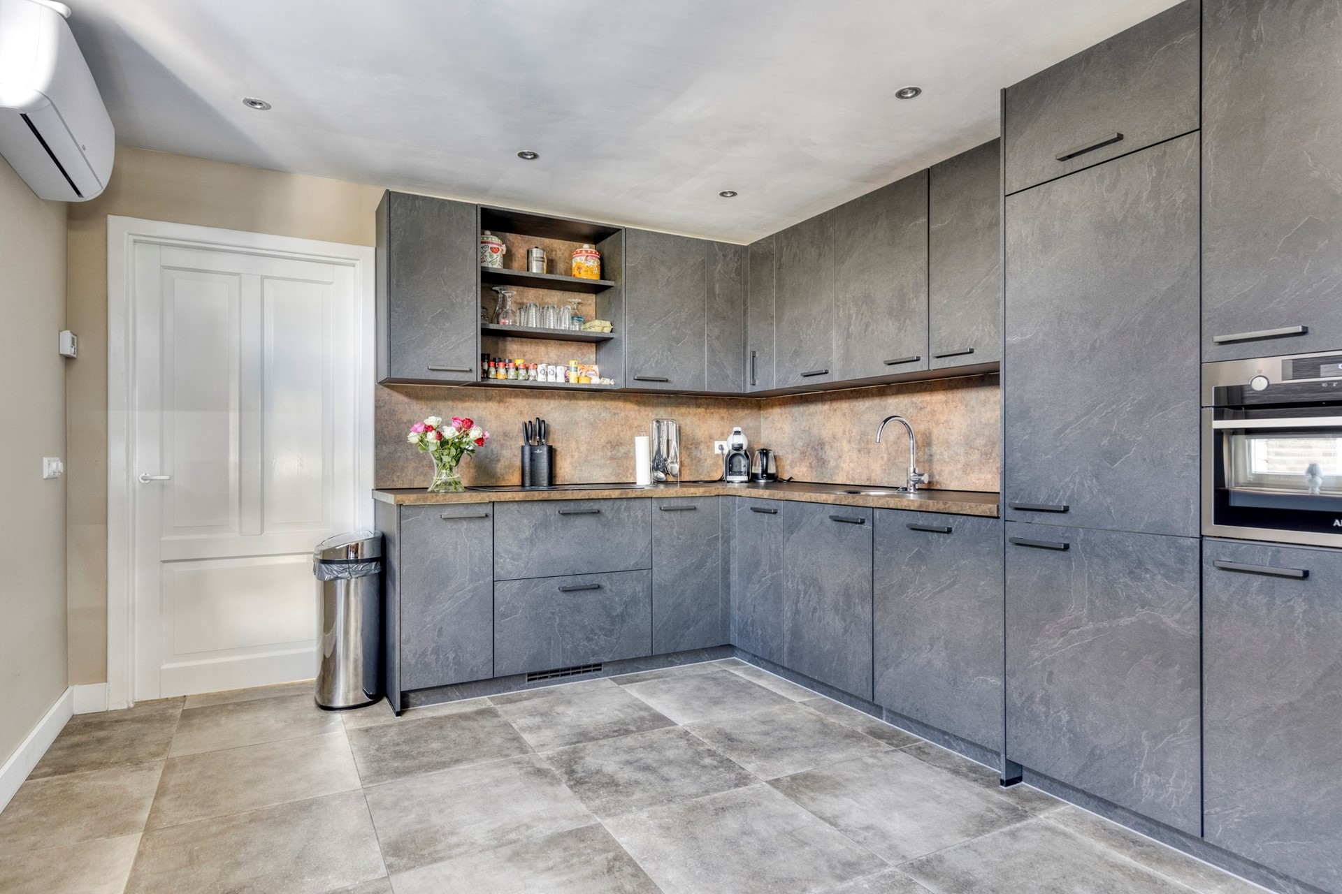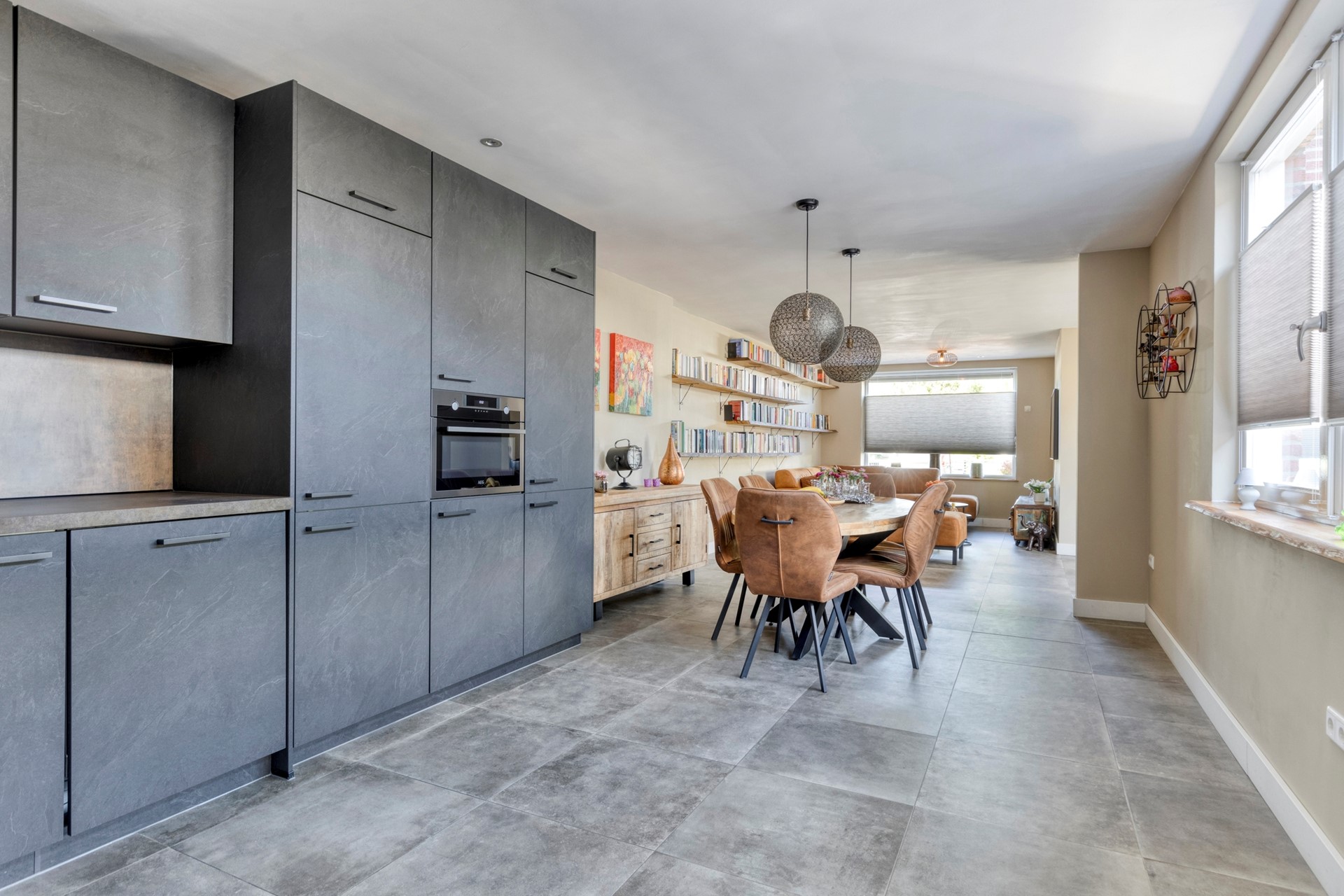 De woonkamer staat in open verbinding met de moderne keuken, die is uitgevoerd in een praktische L-opstelling. De keuken is in december 2023 geplaatst en voorzien van diverse onder- en bovenkasten, laden, een koelkast, grote vriezer, combioven, een inductie kookplaat met geïntegreerde afzuiging, vaatwasser, spoelbak en een kunststof werkblad.