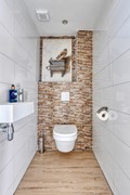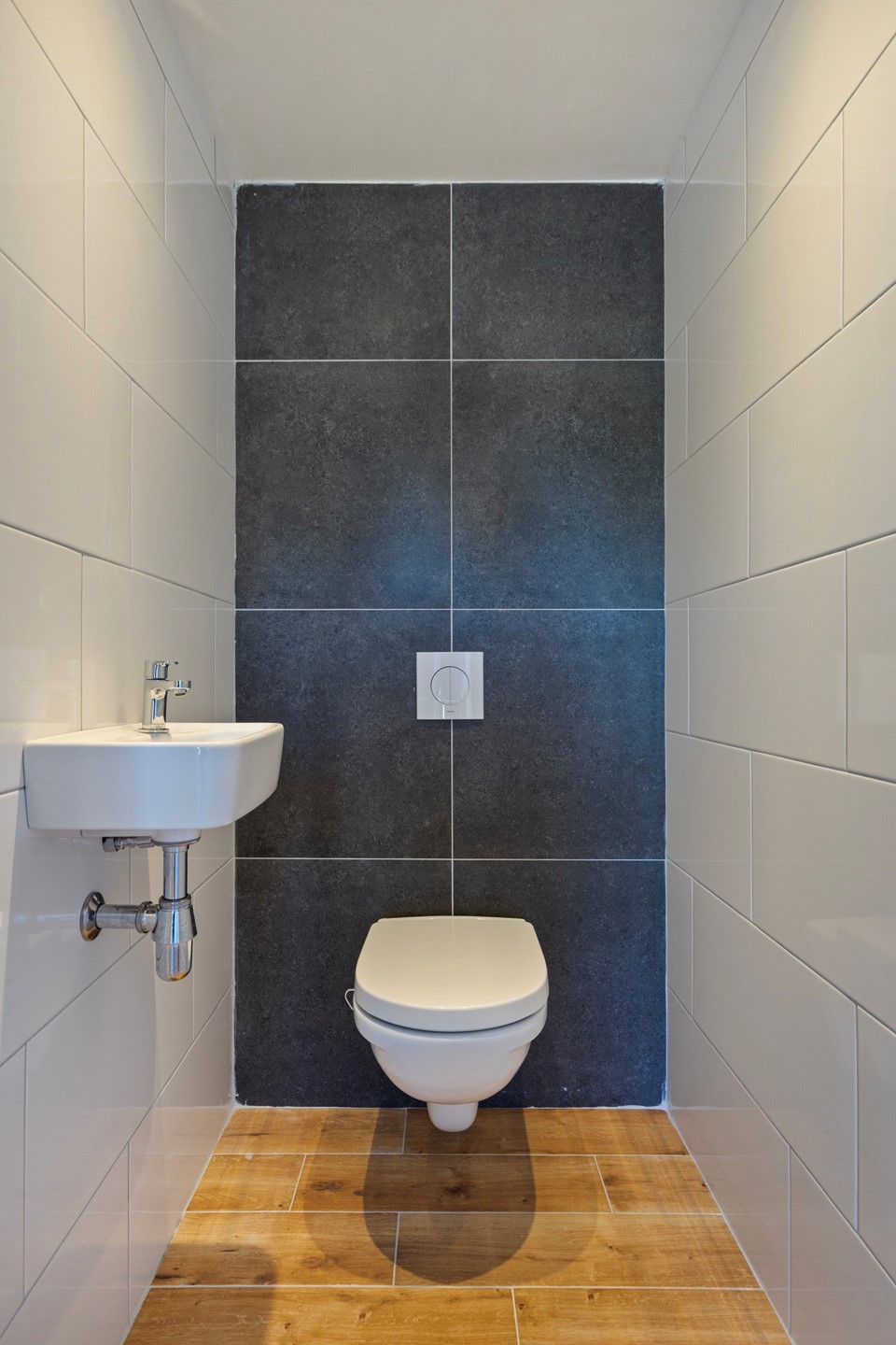+ De volledig betegelde toiletruimte met wandcloset en fontein