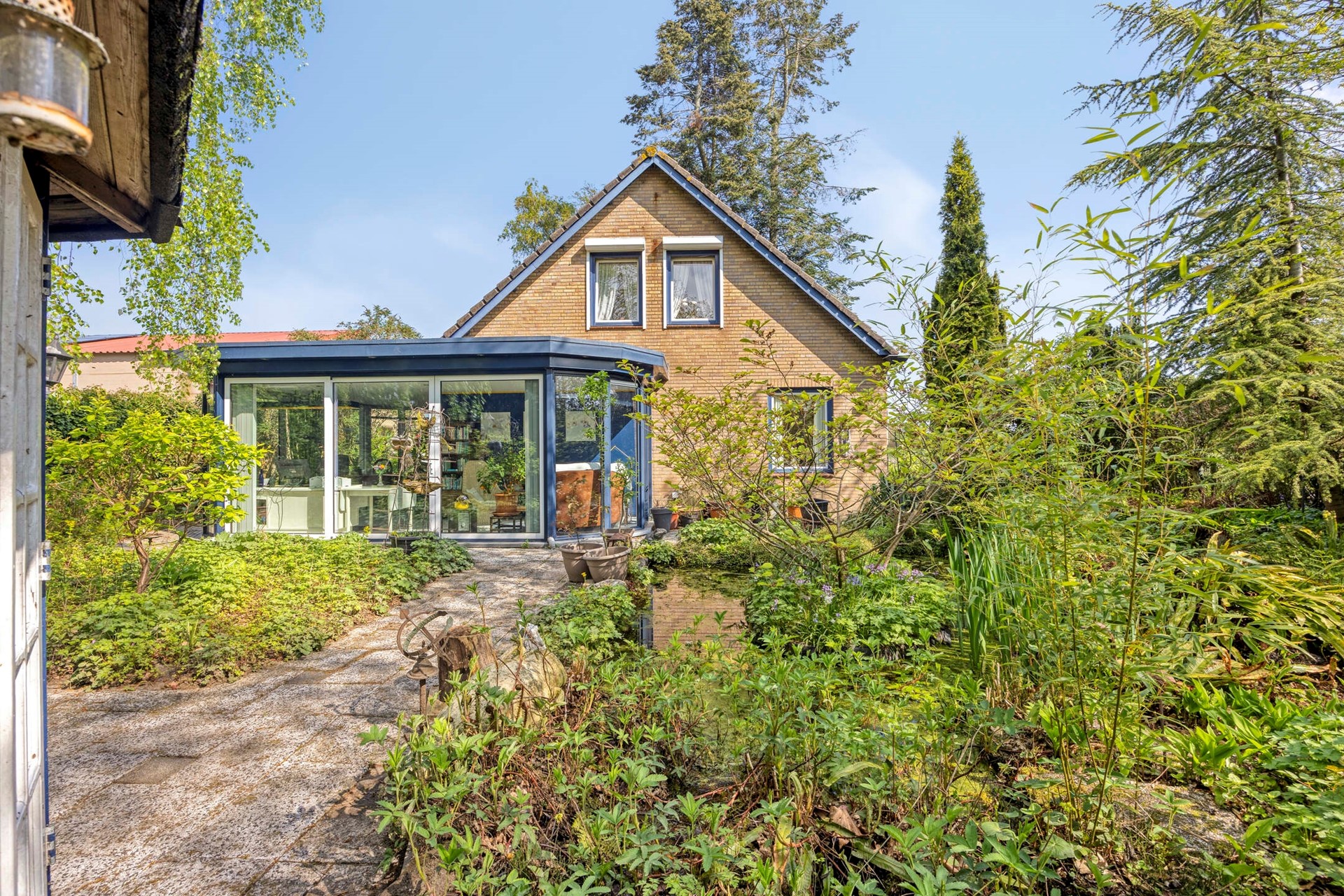 Rondom de woning ligt een ruime en groene tuin met onder andere een vijver, kippenren en een houten tuinhuisje. De tuin biedt volop mogelijkheden om deze geheel naar eigen wens en stijl in te richten.