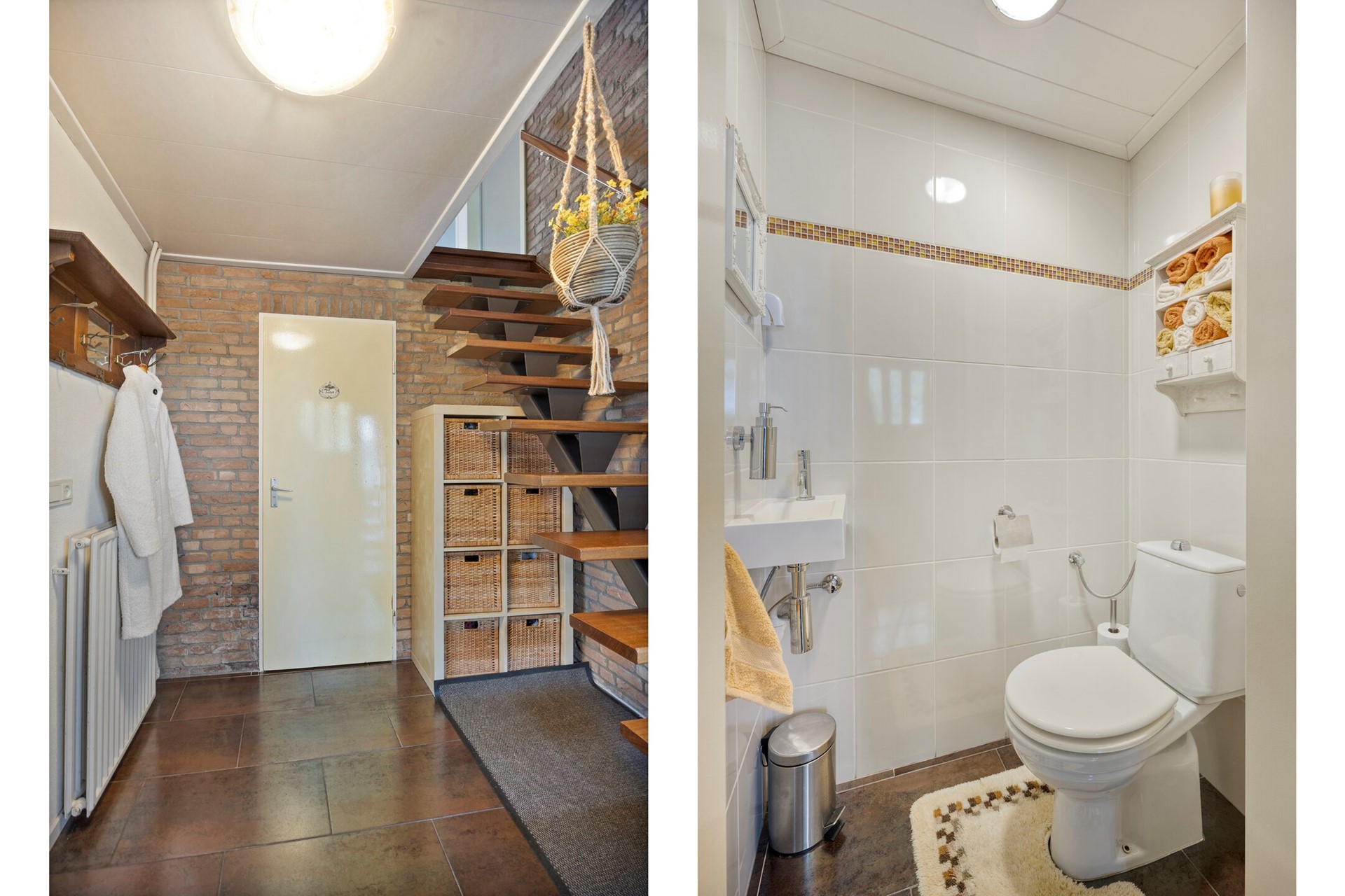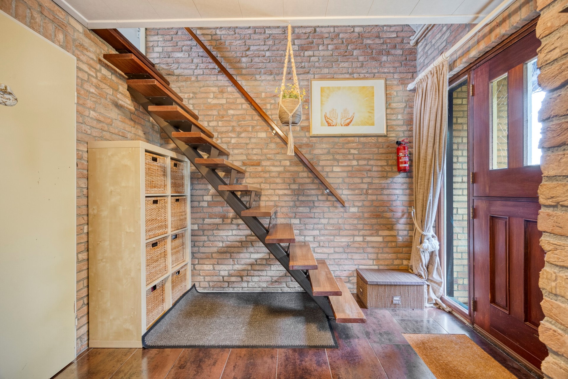 De ruime ontvangsthal biedt toegang tot de meterkast, de trapopgang naar de eerste verdieping, de toiletruimte en de woonkamer. De hal is afgewerkt met een tegelvloer en schoon metselwerk.