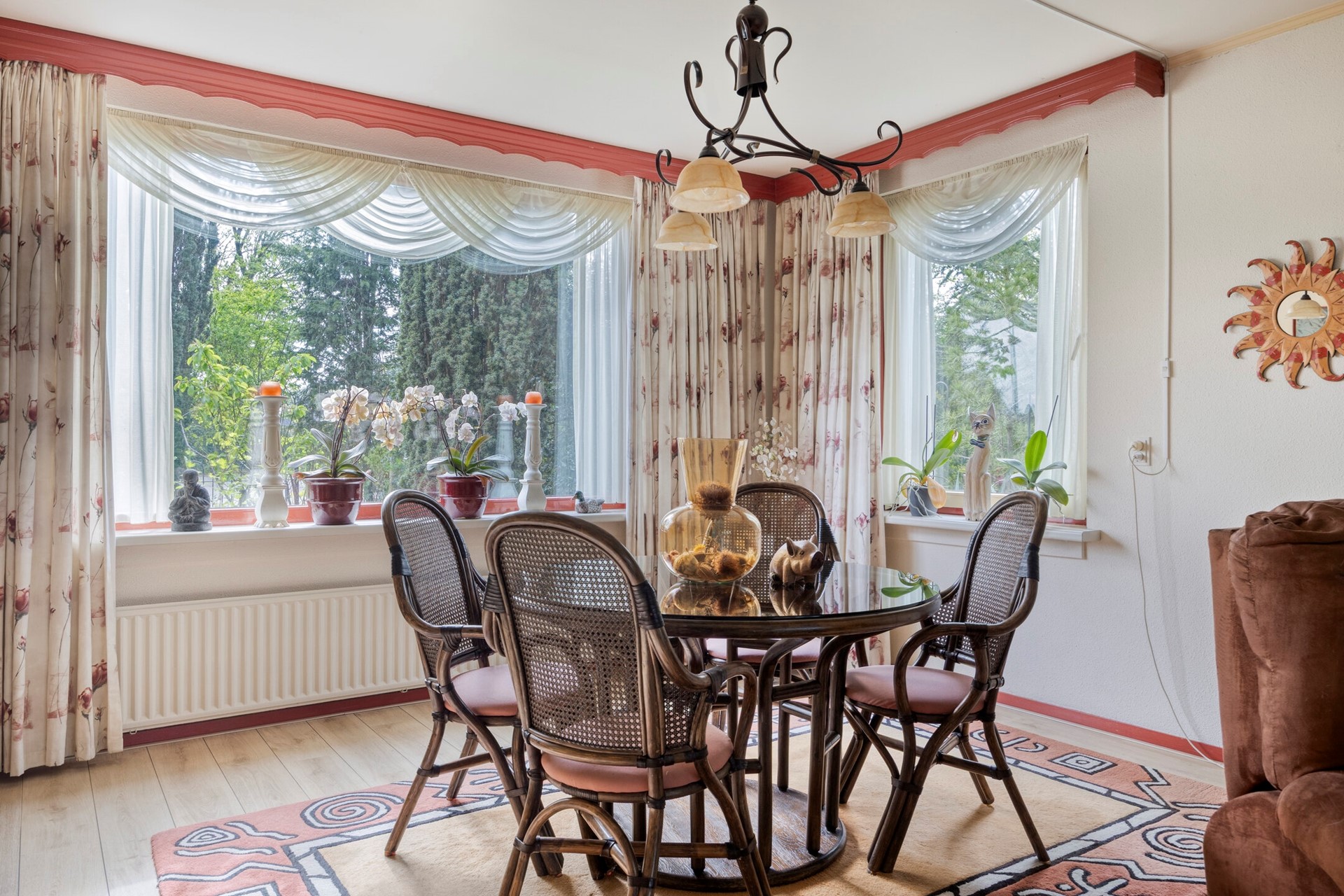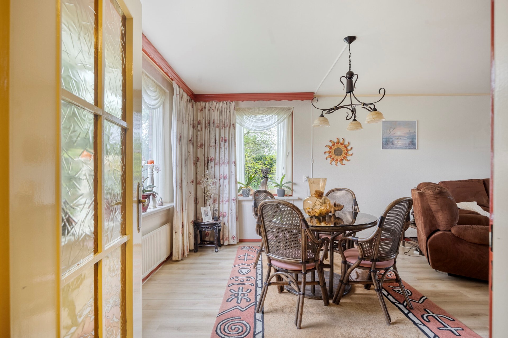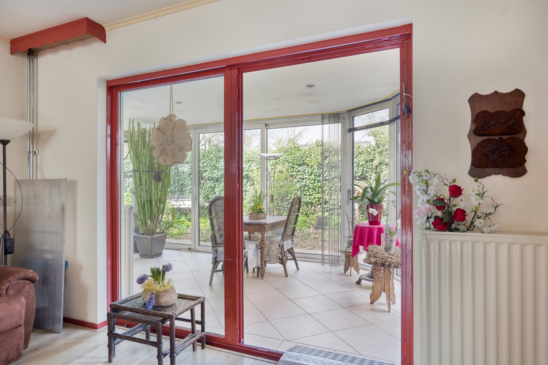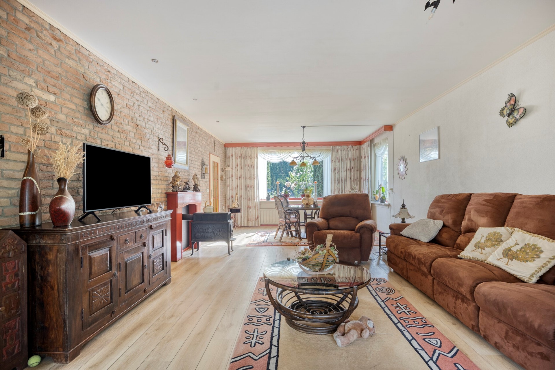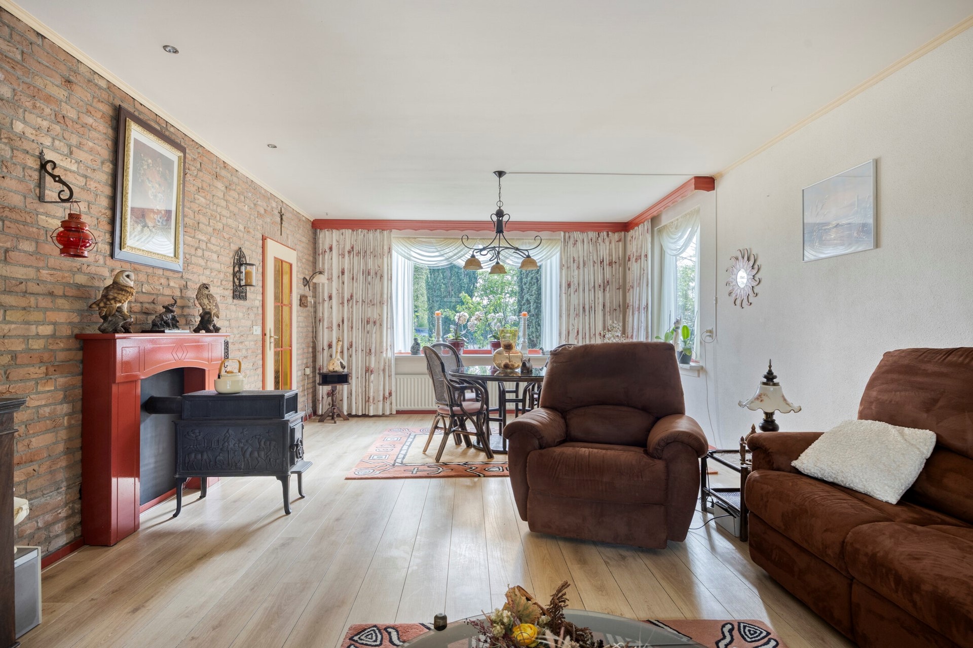 De woonkamer kenmerkt zich door een prettige lichtinval dankzij de vele ramen en de serre aan de achterzijde. Vanuit de serre heeft u direct toegang tot de tuin. De woonkamer is afgewerkt met een laminaatvloer en wanden van deels schoon metselwerk en stucwerk. De serre beschikt over een tegelvloer met vloerverwarming.
