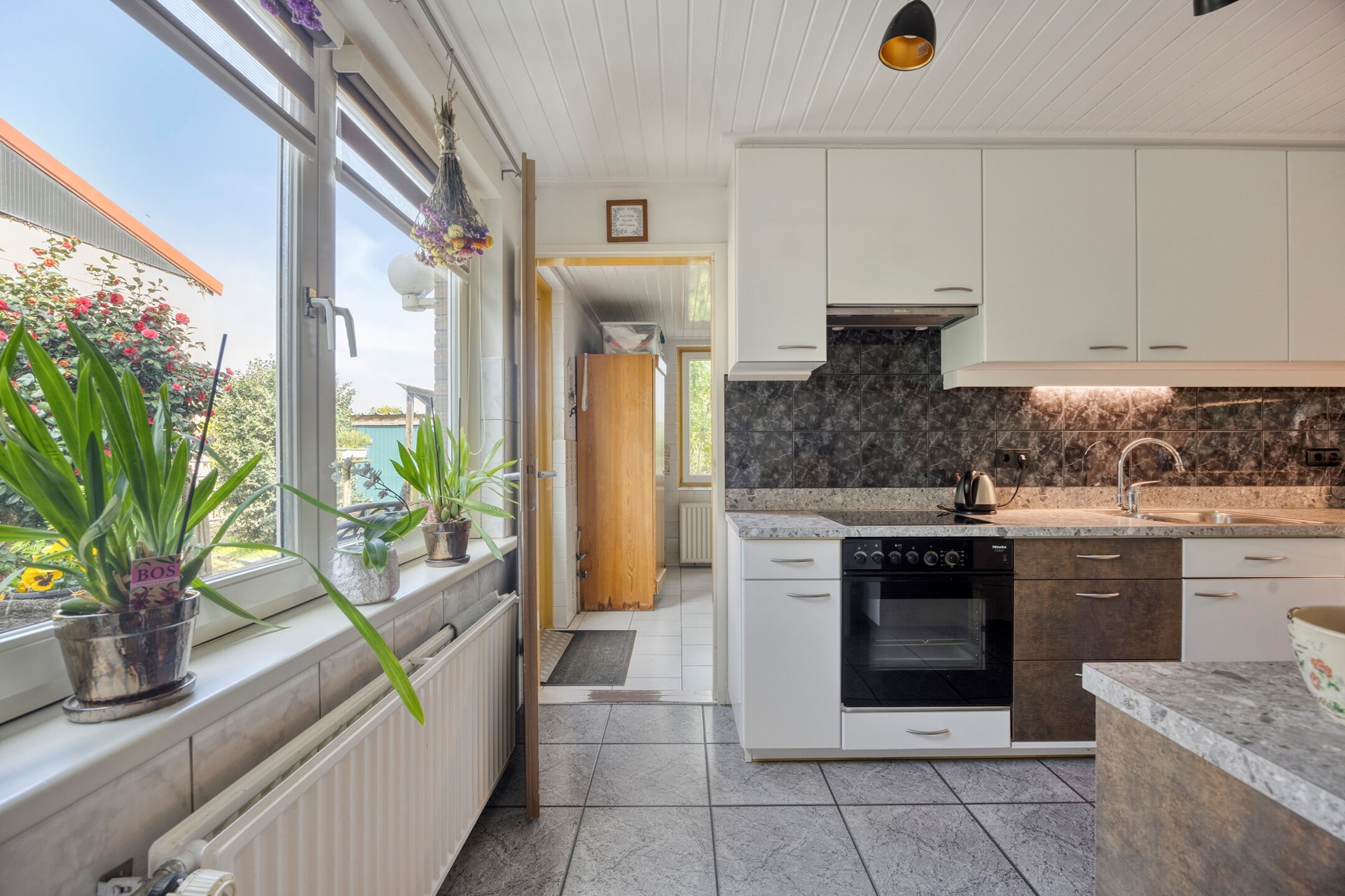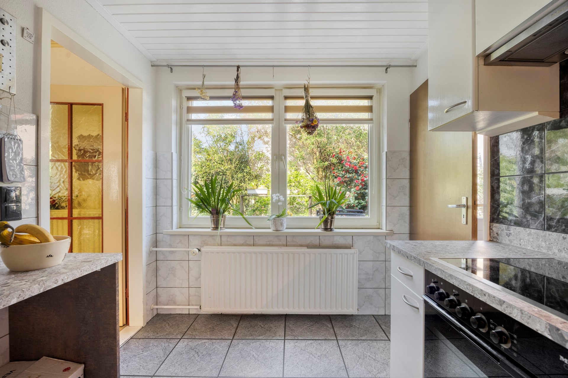 De keuken bevindt zich aan de achterzijde van de woning en is uitgevoerd in een lichte opstelling. Deze is uitgerust met een elektrische kookplaat, RVS-afzuigkap en koelkast. De combinatie van lades en bovenkasten zorgt voor voldoende bergruimte.