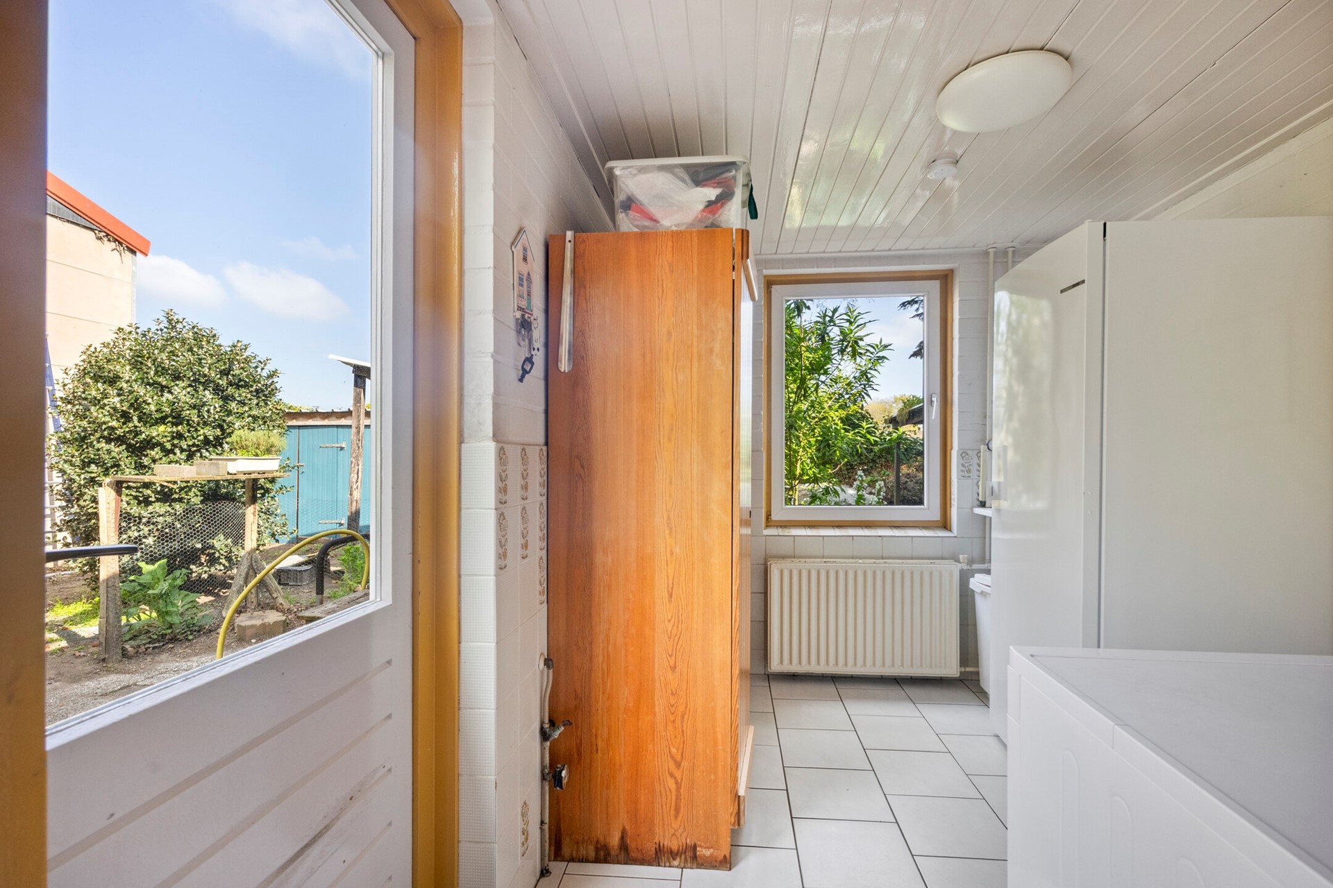 Aangrenzend bevindt zich de praktische bijkeuken, ideaal voor het plaatsen van een wasmachine, droger en extra koelkast. Vanuit hier heeft u toegang tot zowel de achtertuin als de inpandige garage.