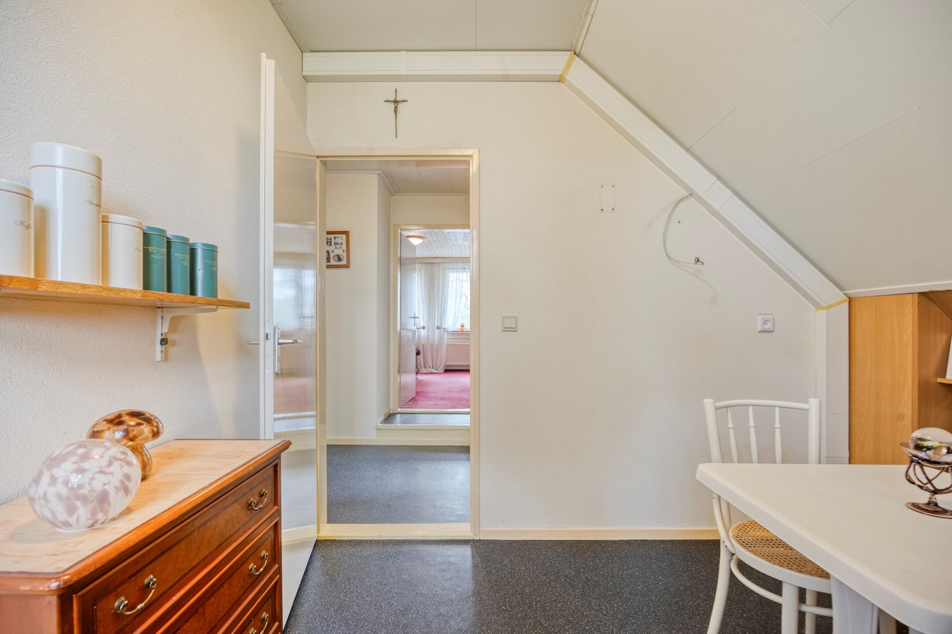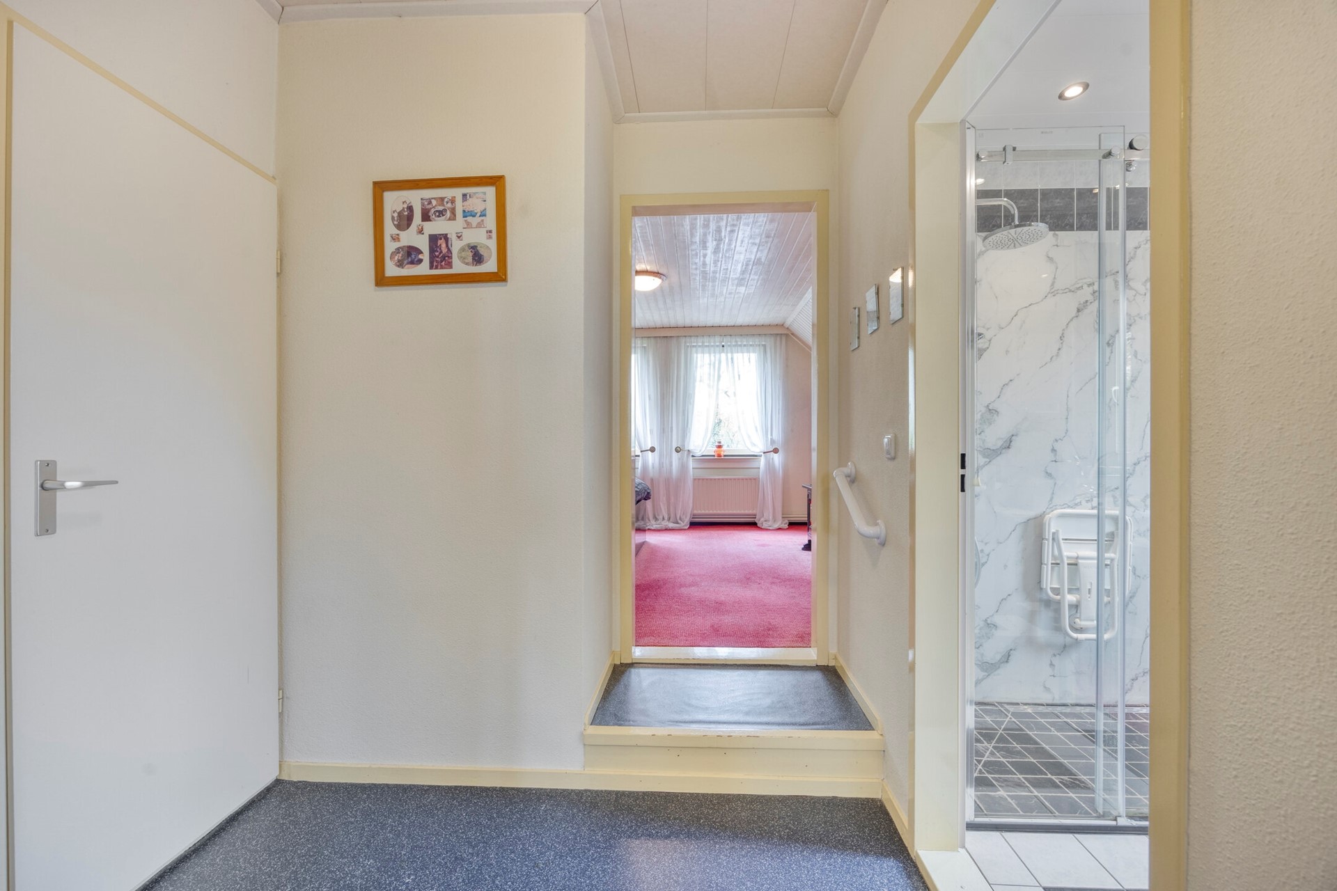 De trap in de ontvangsthal leidt naar de overloop op de eerste verdieping. Vanuit hier heeft u toegang tot drie slaapkamers, een technische ruimte en de badkamer. De overloop en één slaapkamer zijn afgewerkt met zeil, de overige twee slaapkamers beschikken over vloerbedekking.